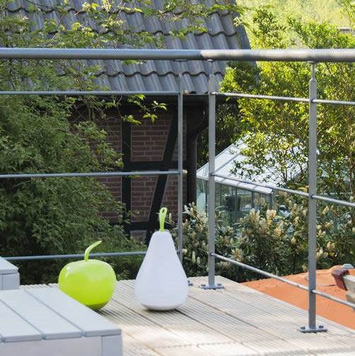 Der matt-graue Stahl des Balkongeländers aus unserer Schmiede ist vielfältig kombinierbar. Hochwertiges Massivholz, unter anderem rötliche, orange-braune Lärche aus Europa oder dunkelbraune, grünliche Ipé aus Südamerika, sind ideale Kandidaten und spiegeln den Kontrast aus Natur und Moderne wieder.